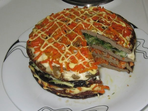 Печеночный торт с морковью и луком