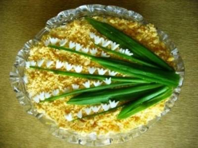 7 Верх засыпать измельченными желтками. Из белка вырезать ландыши. Из зеленого лука, ножницами вырезать листья ландышей.